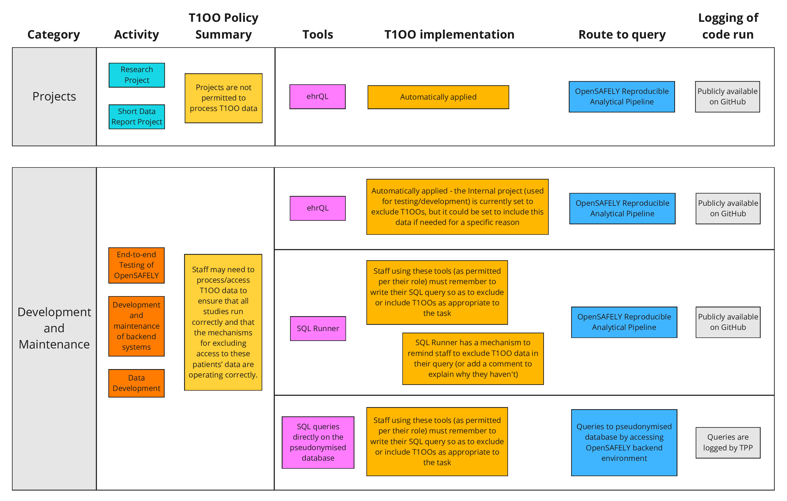 In order to facilitate the operation and maintenance of the OpenSAFELY platform a small number of individuals are able to access the pseudonymised data directly, without going via ehrQL or SQL Runner. It is important to note that the code run in such circumstances will not be publicly visible on our “jobs” server, but it is logged in the database audit file of the GP system suppliers; preventing access to patient data with a type 1 opt-out is not enforceable at this level.